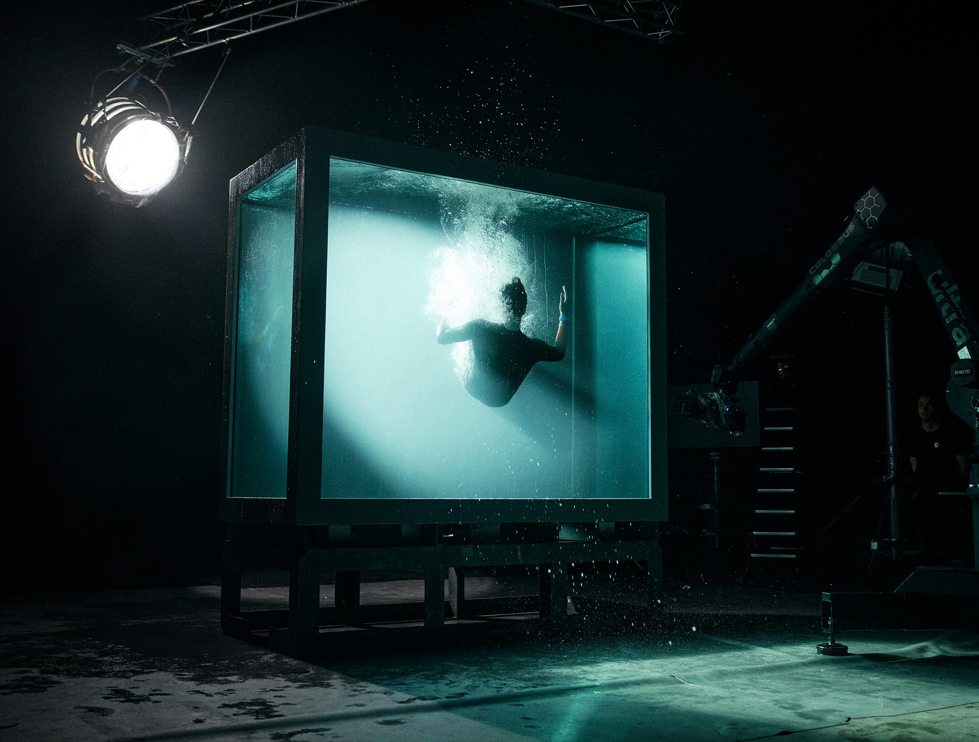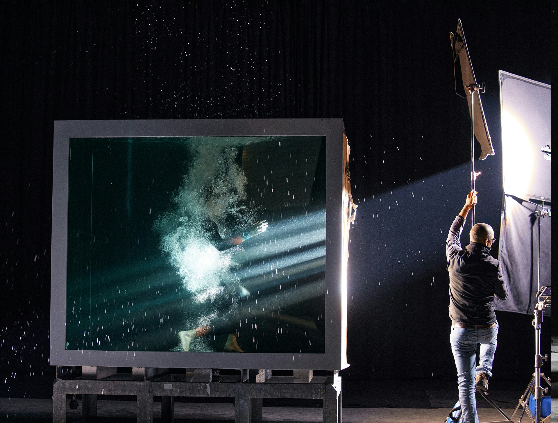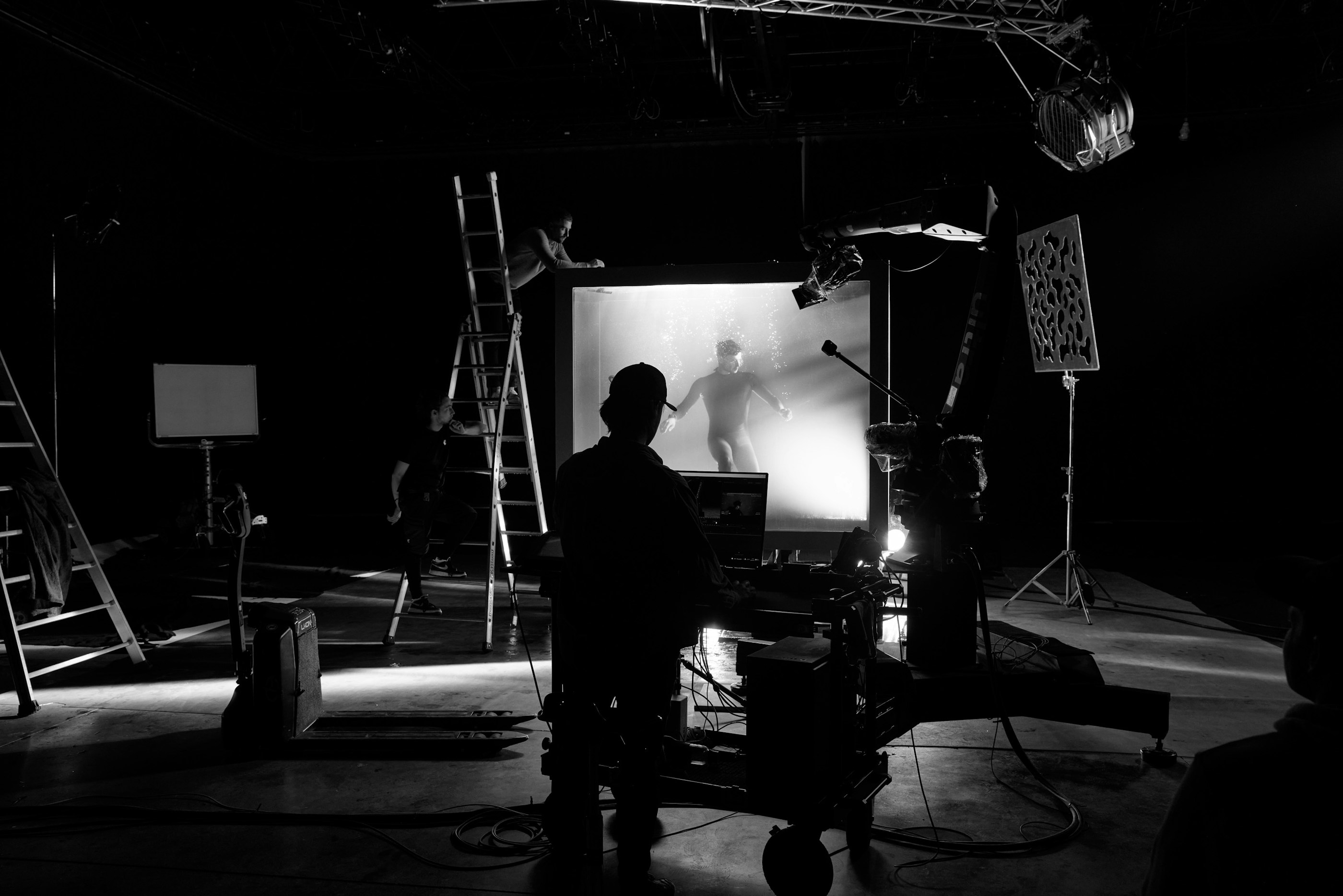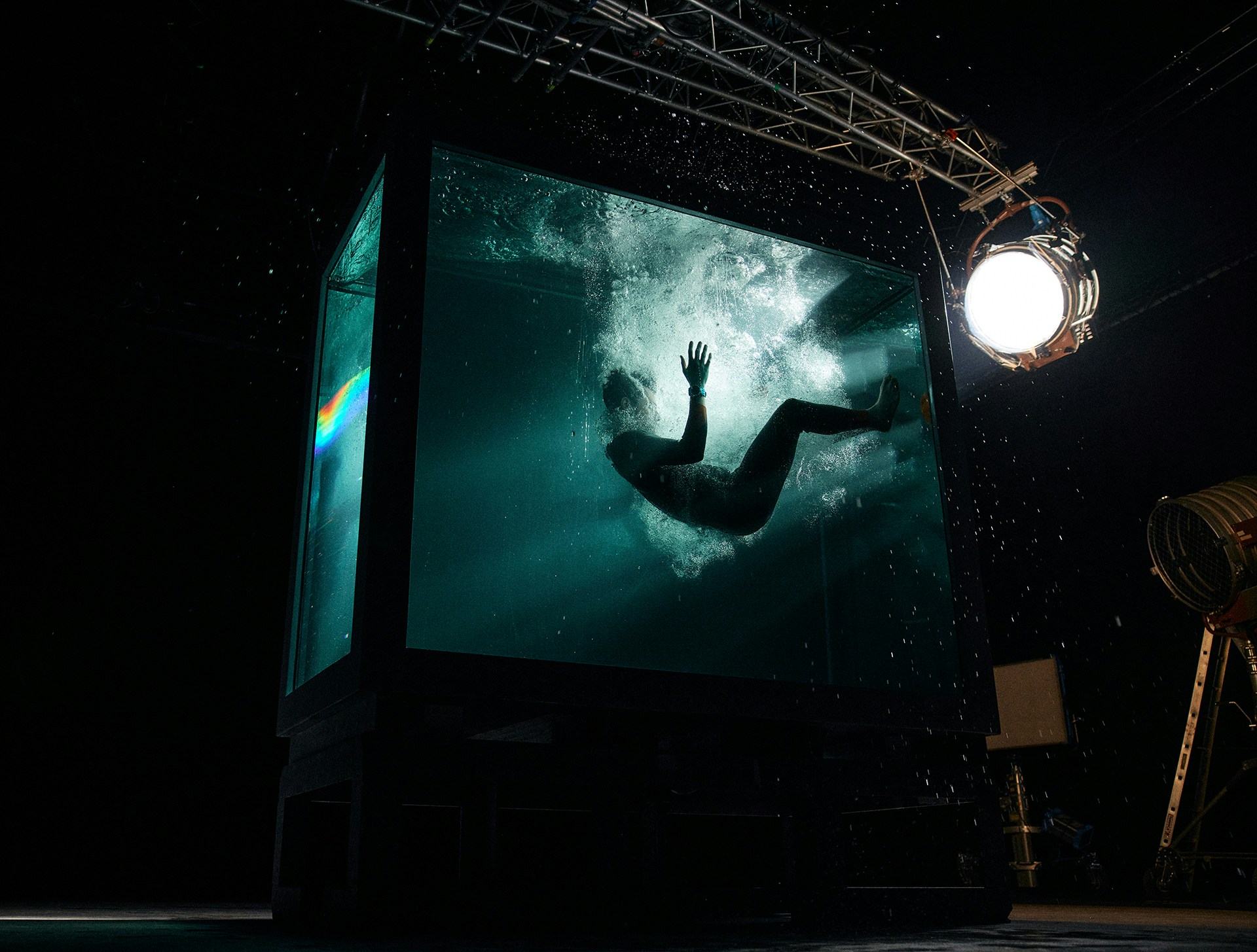 To achieve this contrast, the entire film was shot in a Paris studio, in a custom-built 15m³ aquarium capable of holding 15,000 litres of water and giving the diver room to manoeuvre with ease. Not only did it enable us to introduce a framing device that we could play with to develop the visual narrative, but thanks to a robotic arm equipped with a high-speed Phantom camera, we also achieved shots that would be impossible at sea.