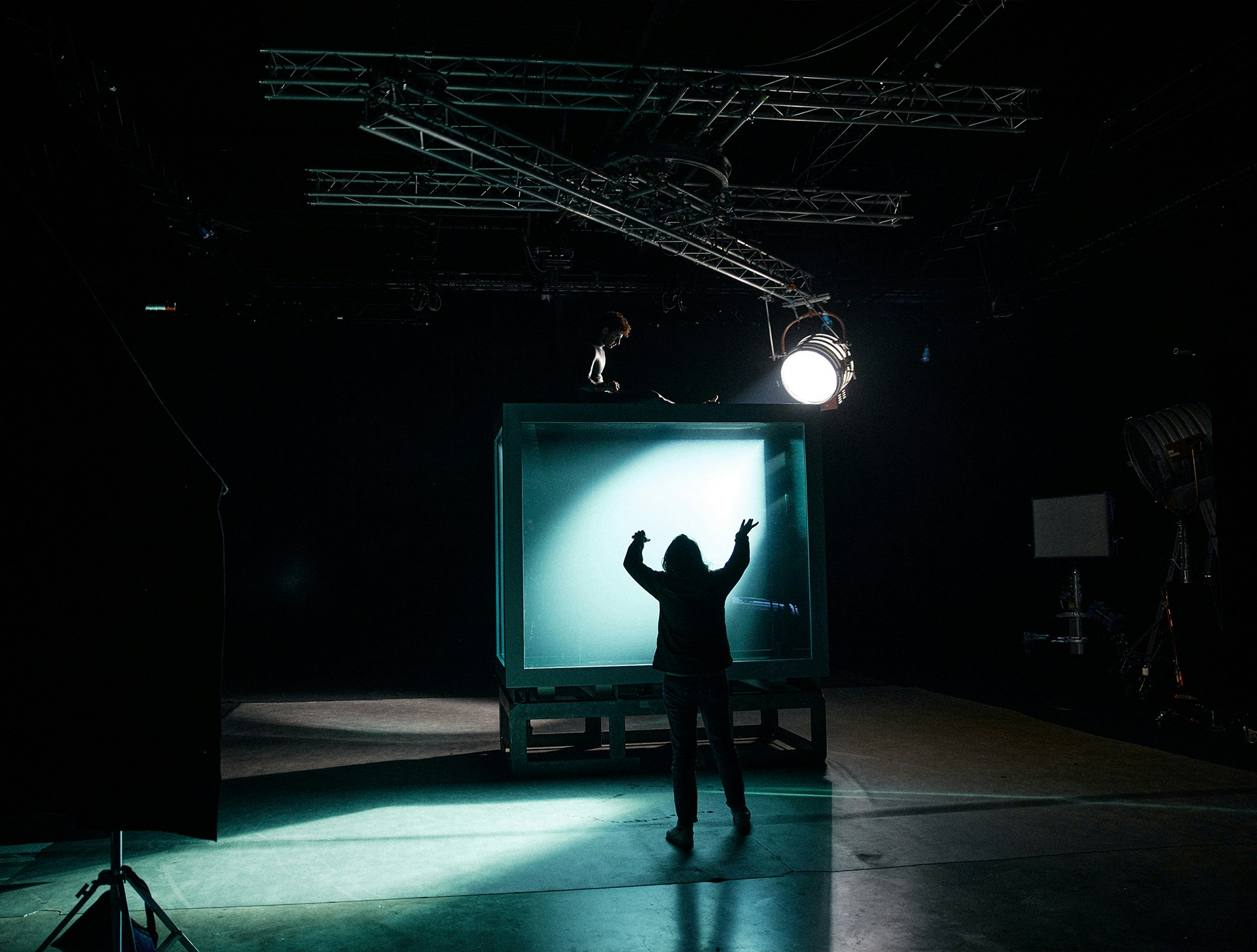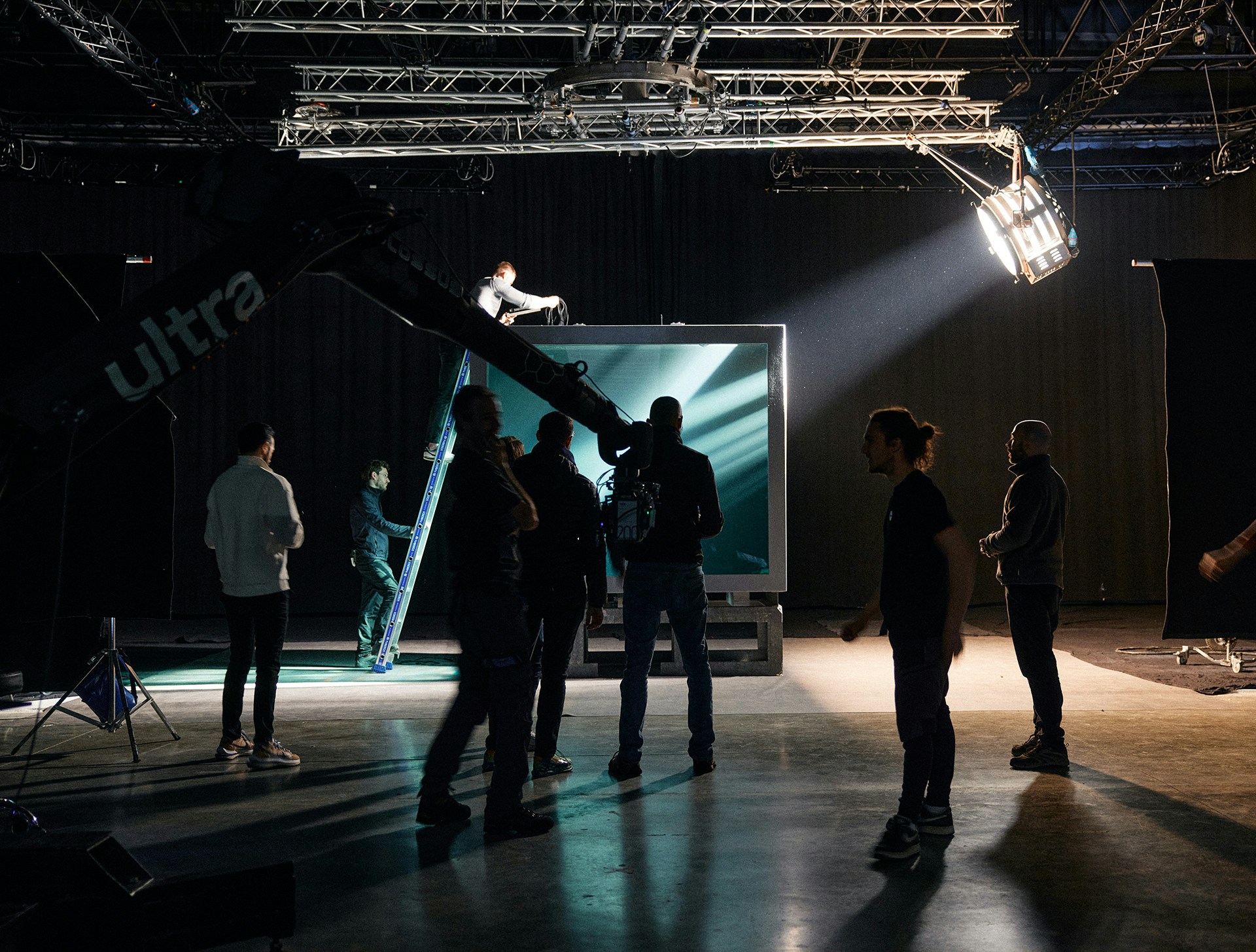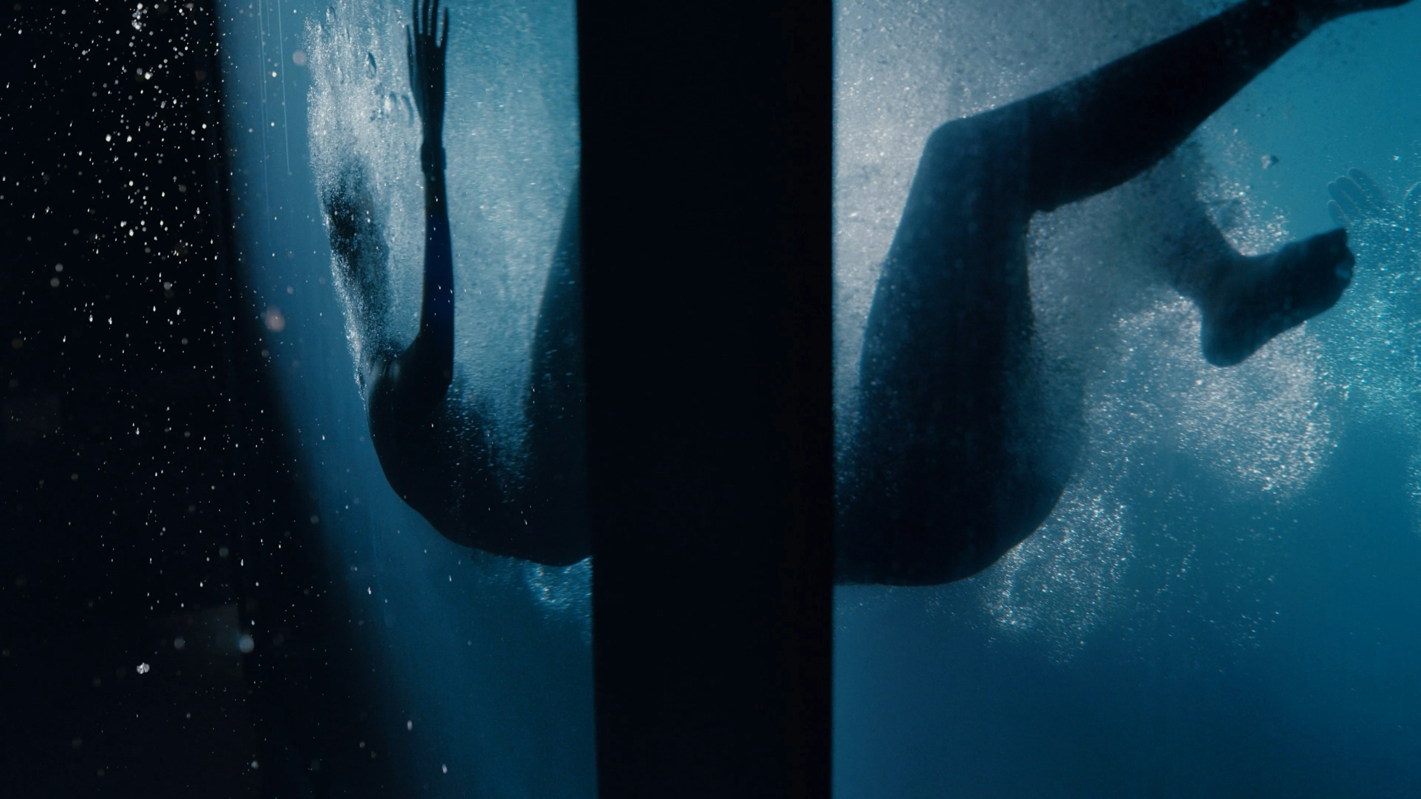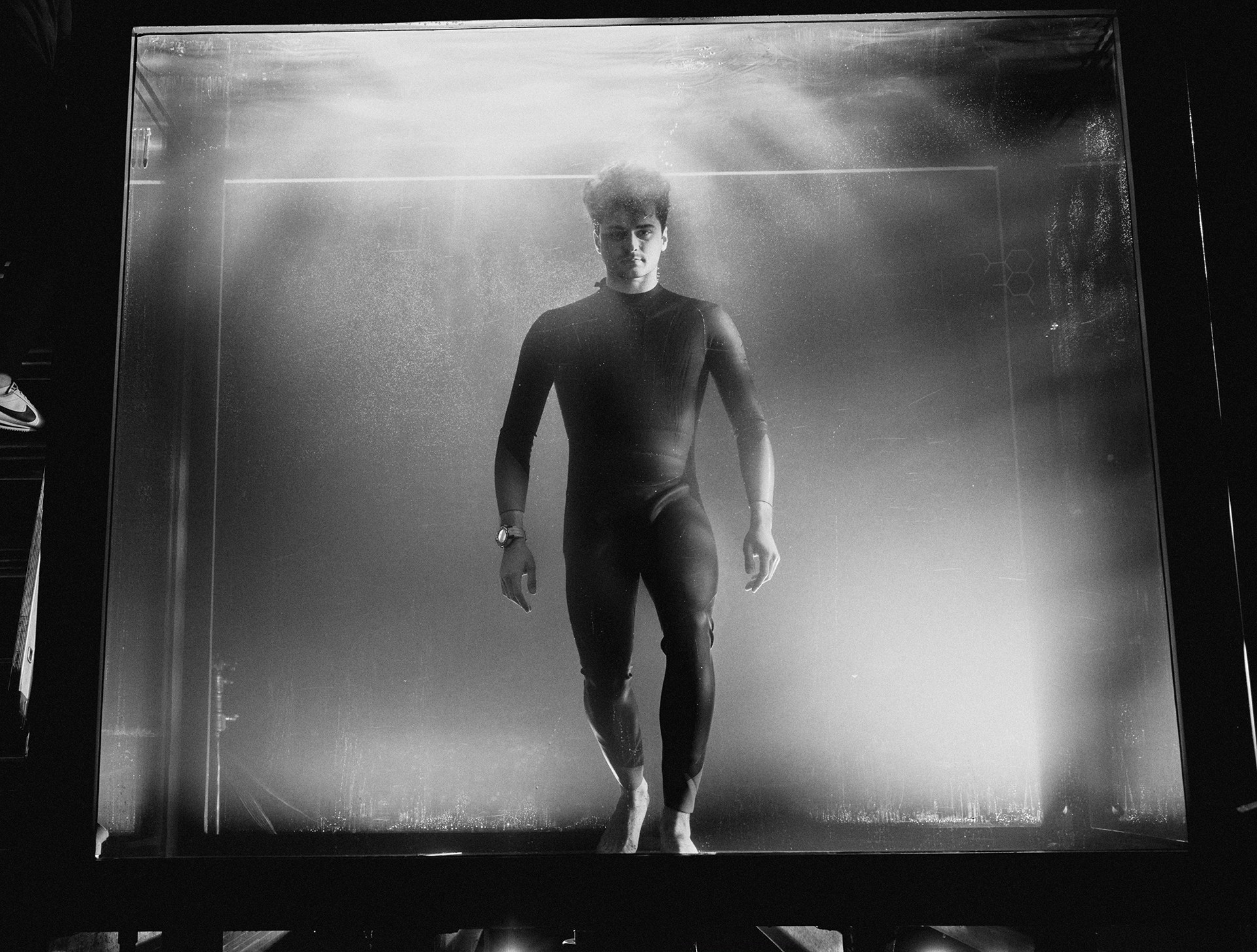 To achieve this contrast, the entire film was shot in a Paris studio, in a custom-built 15m³ aquarium capable of holding 15,000 litres of water and giving the diver room to manoeuvre with ease. Not only did it enable us to introduce a framing device that we could play with to develop the visual narrative, but thanks to a robotic arm equipped with a high-speed Phantom camera, we also achieved shots that would be impossible at sea.
