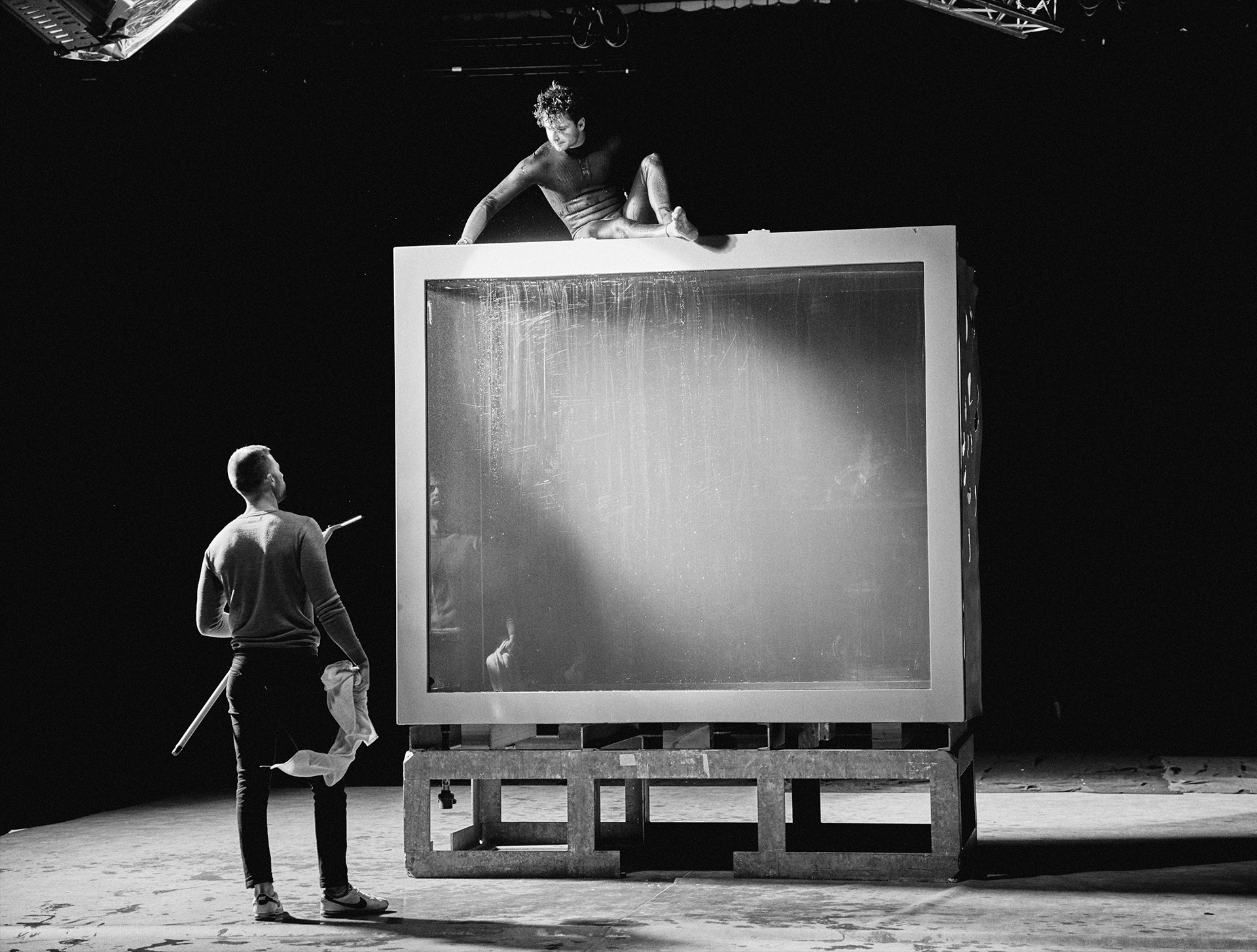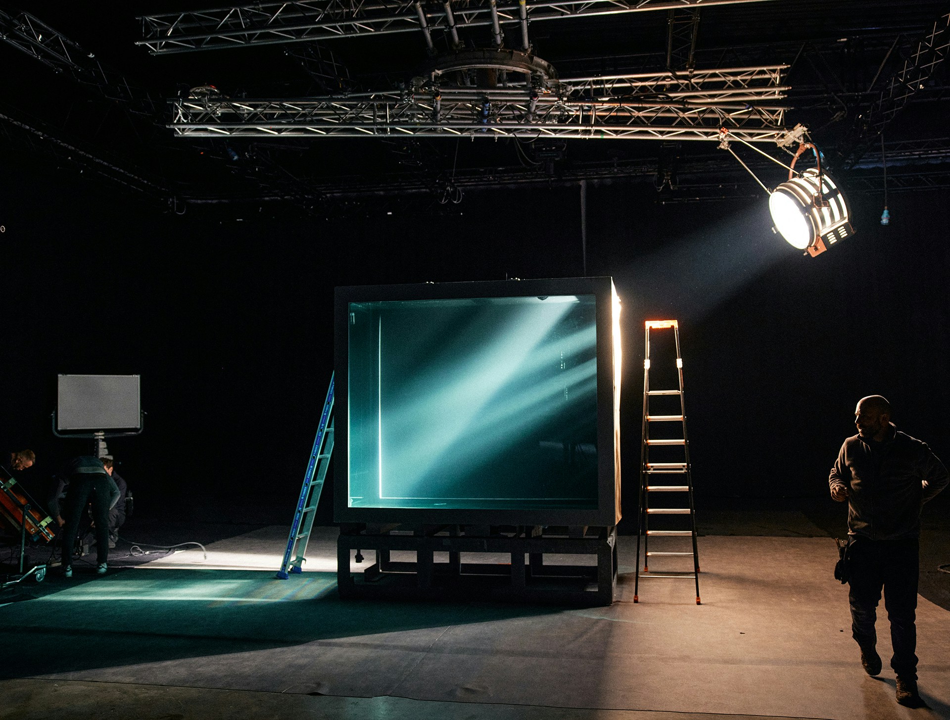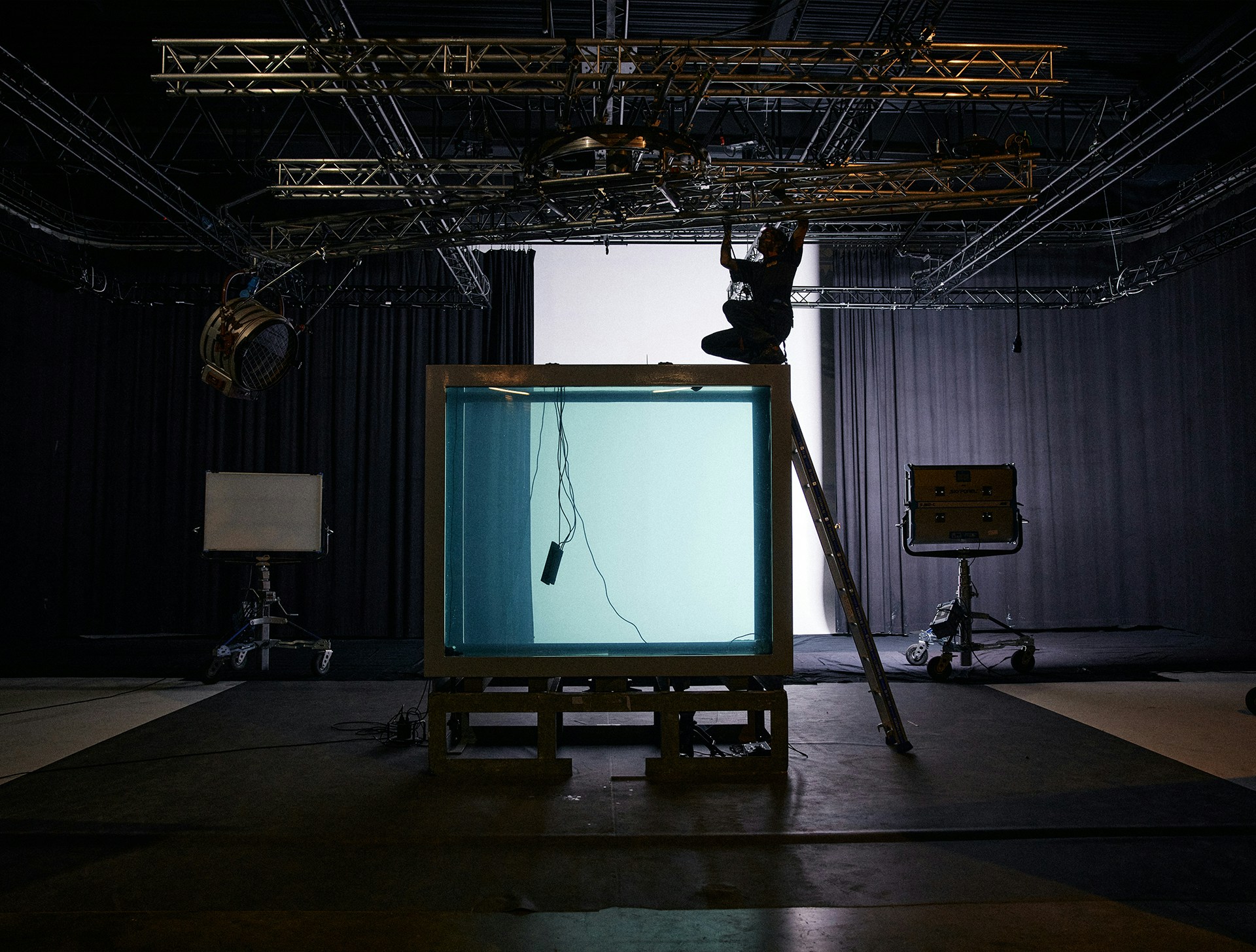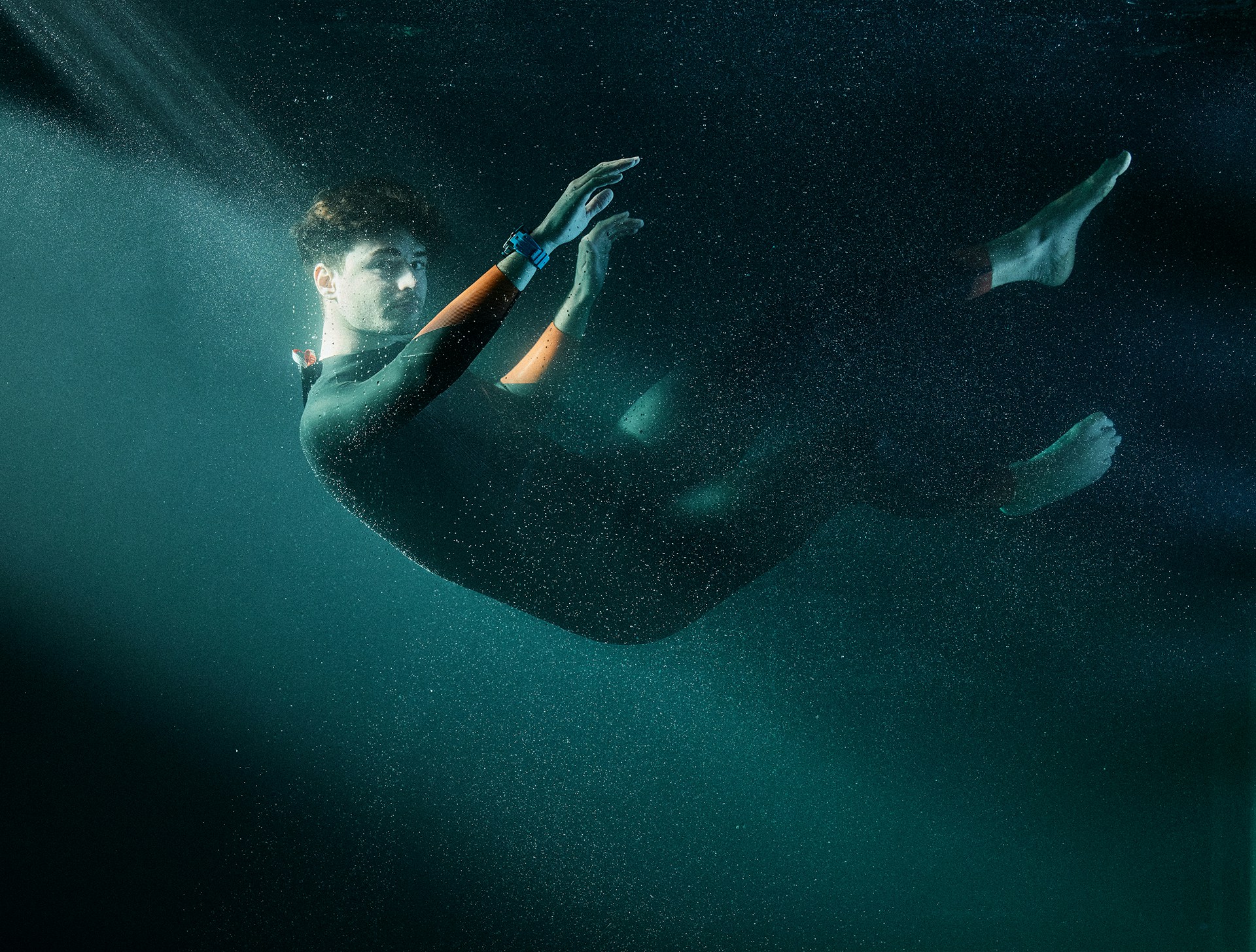 To achieve this contrast, the entire film was shot in a Paris studio, in a custom-built 15m³ aquarium capable of holding 15,000 litres of water and giving the diver room to manoeuvre with ease. Not only did it enable us to introduce a framing device that we could play with to develop the visual narrative, but thanks to a robotic arm equipped with a high-speed Phantom camera, we also achieved shots that would be impossible at sea.