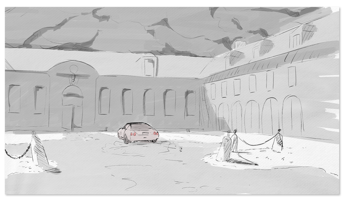 The sky threatens. A mysterious man arrives at a grand palace in an Italian supercar, and as he steps out his aura is palpable. On his way he passes a thoroughbred stallion – both stop to recognise each other’s untamed nature. Then we follow him inside: is he here for a secret party or something more profound? The answer awaits behind a pair of towering doors…